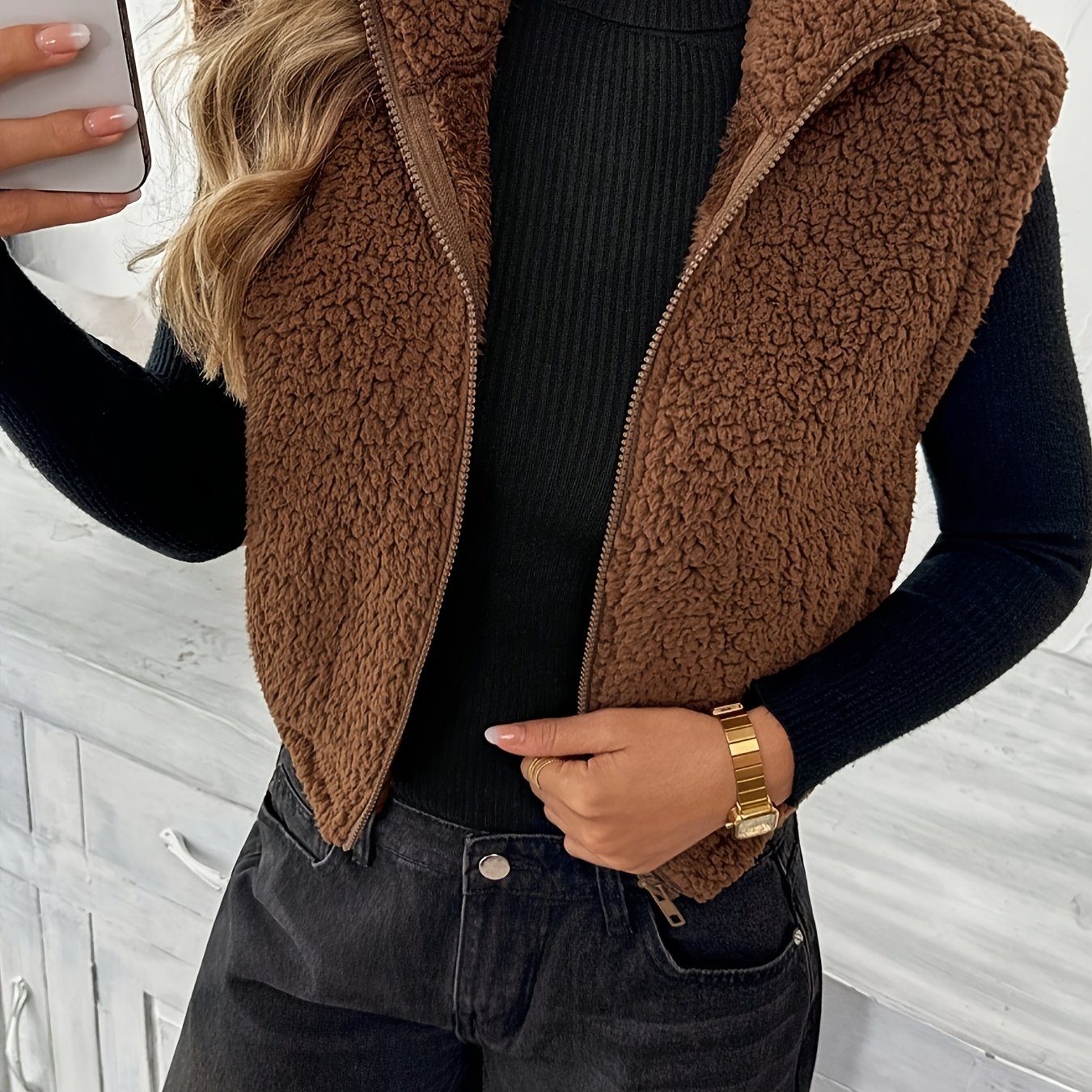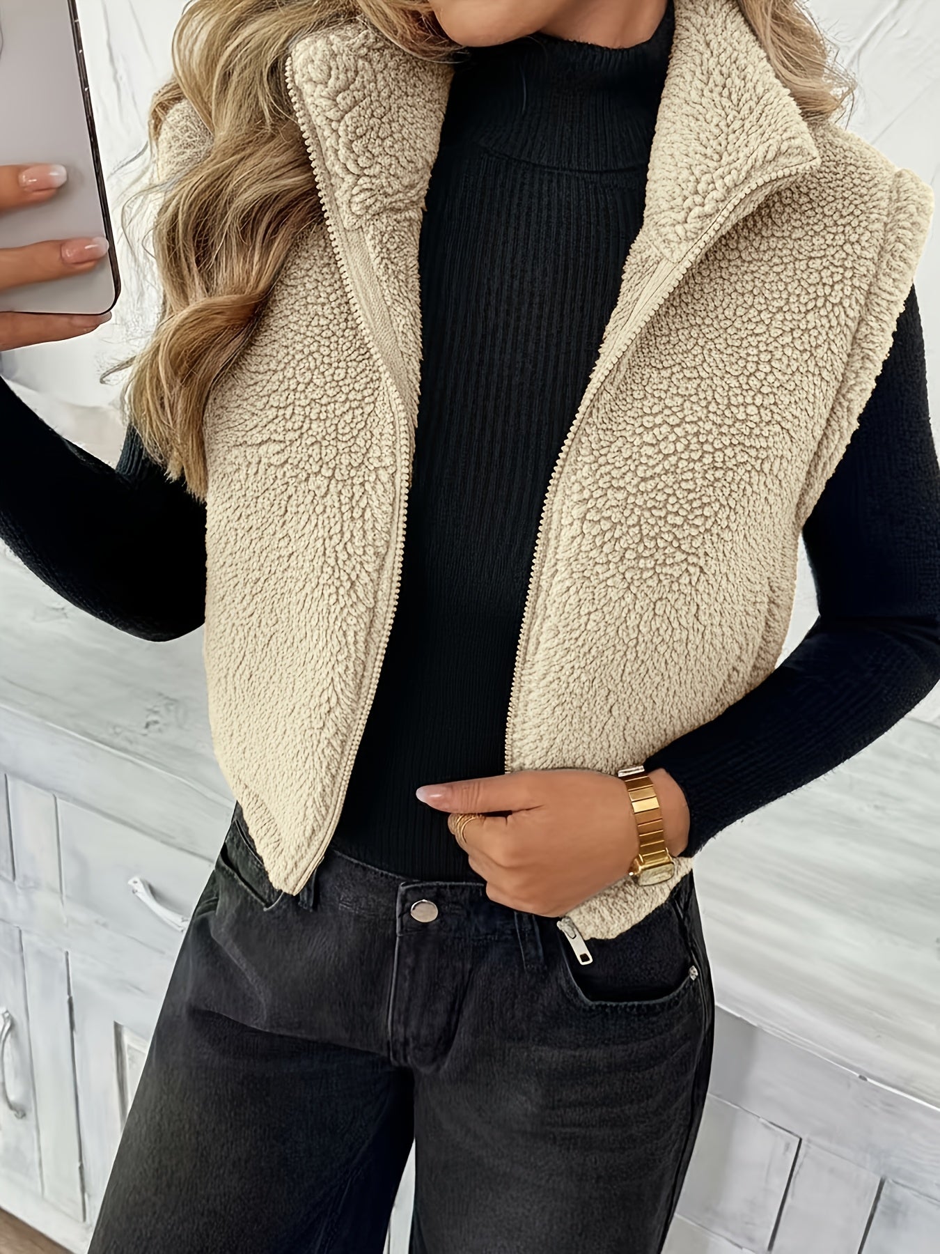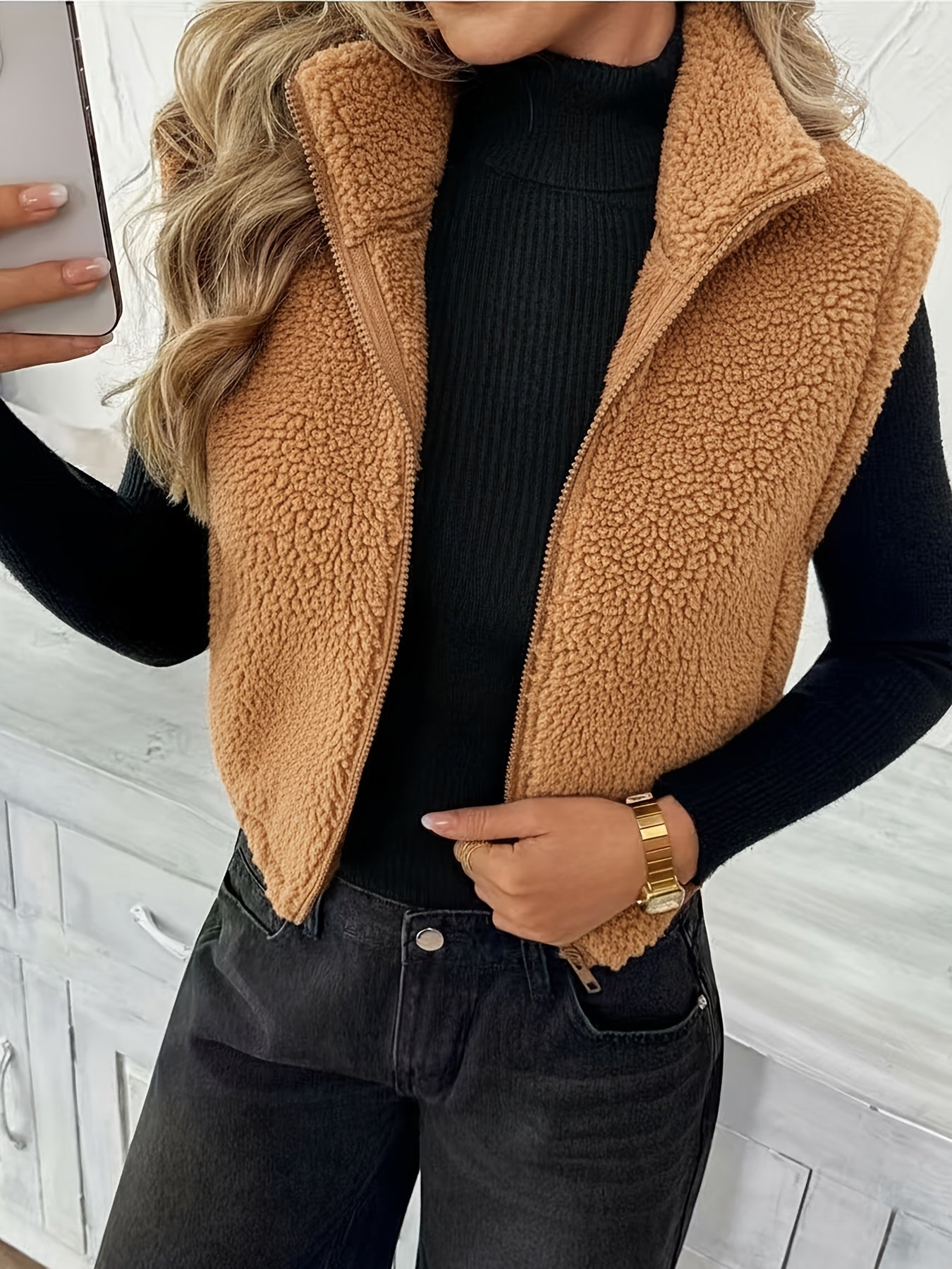 With its soft teddy fleece texture, zip-up front, and sleeveless cut, the Delia™ Fleece Vest is perfect for transitional weather and cozy layering. The cardigan-style collar adds a relaxed yet refined feel, while the solid color design keeps it versatile and easy to style.