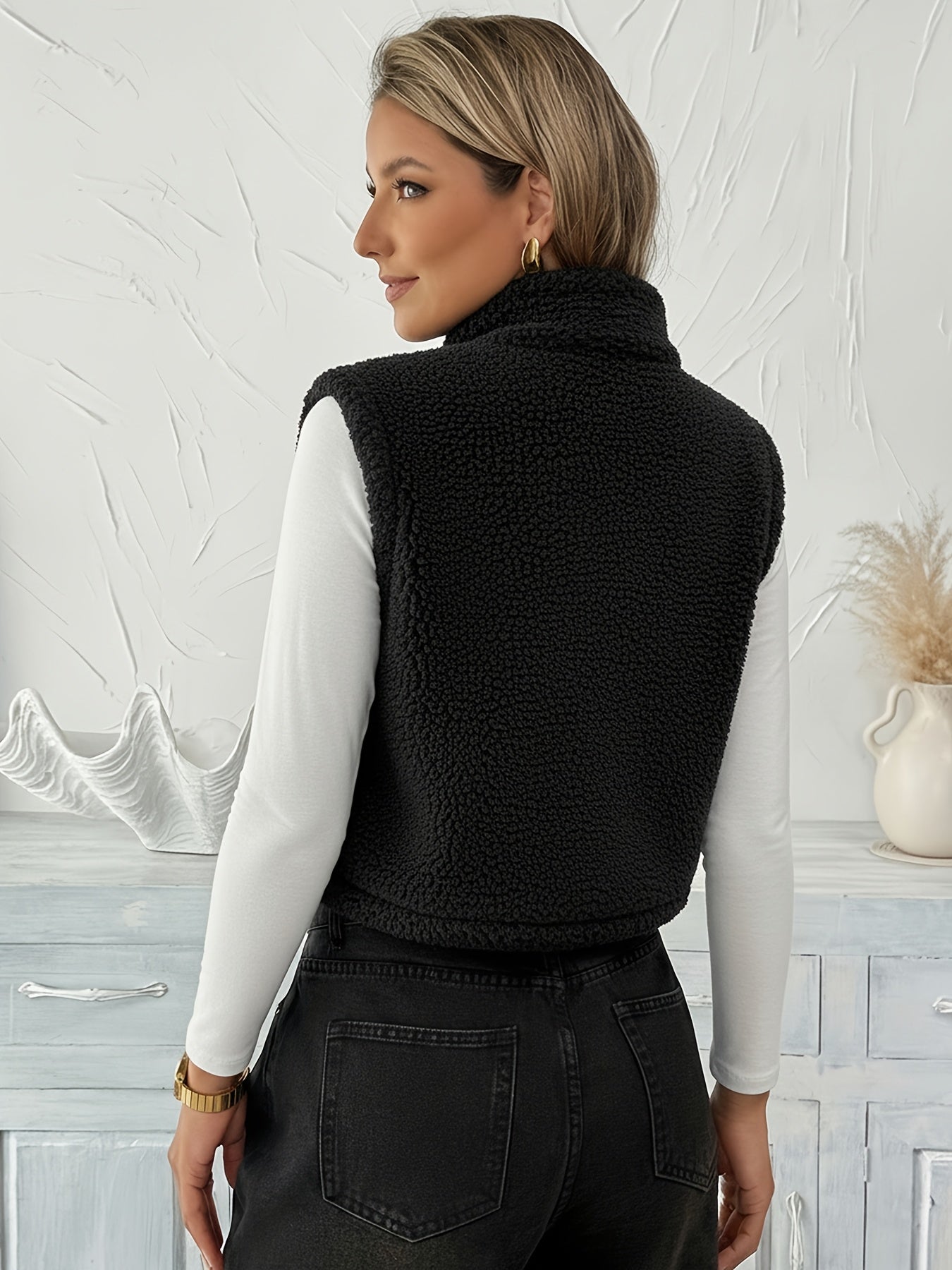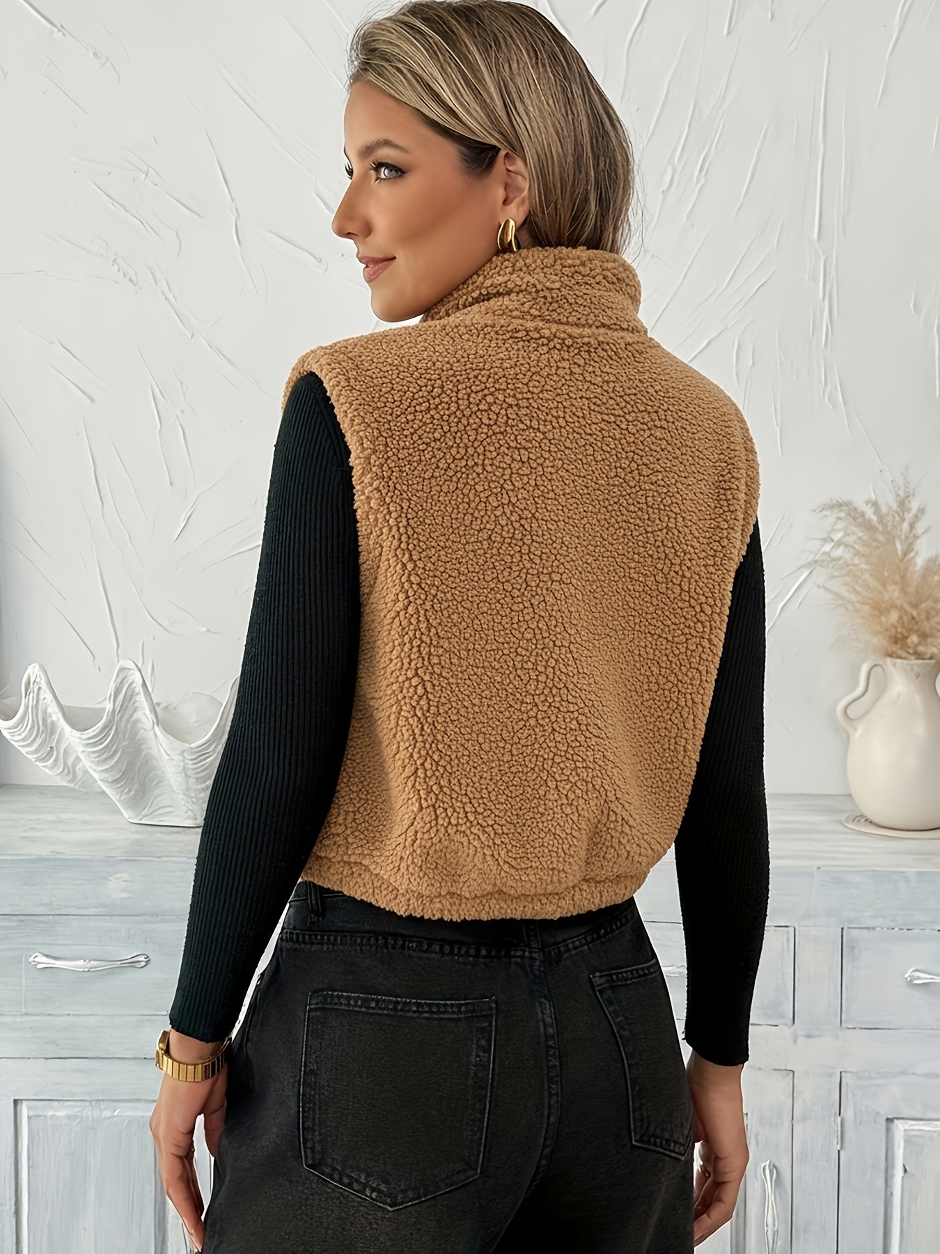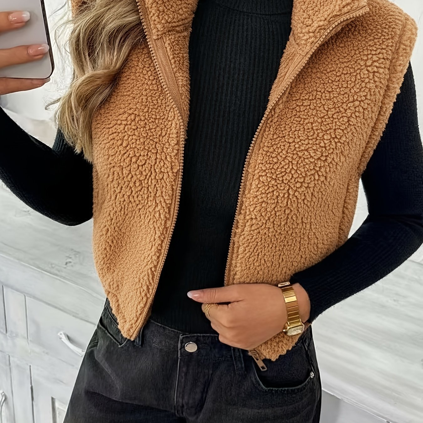 With its soft teddy fleece texture, zip-up front, and sleeveless cut, the Delia™ Fleece Vest is perfect for transitional weather and cozy layering. The cardigan-style collar adds a relaxed yet refined feel, while the solid color design keeps it versatile and easy to style.