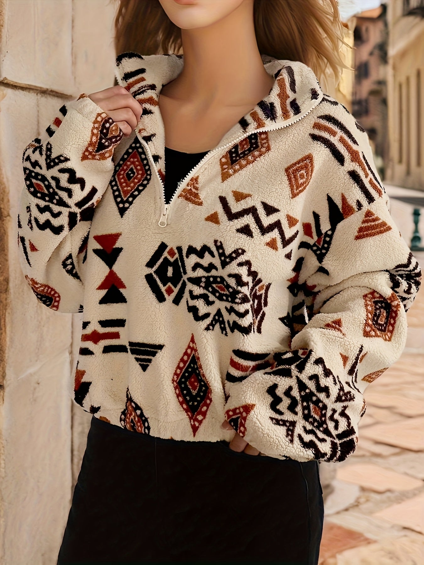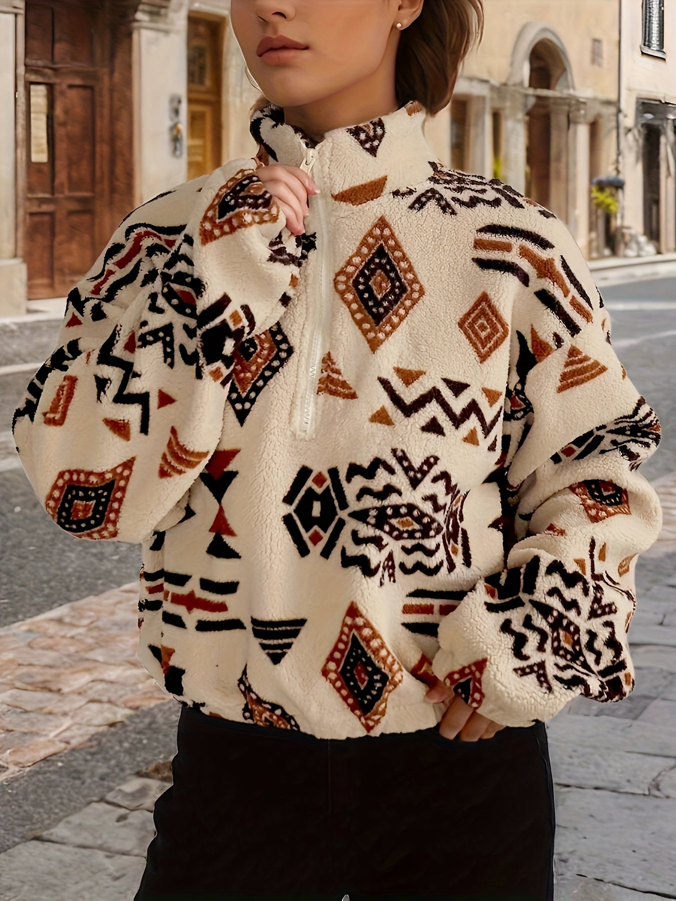 Made from ultra-soft fleece with a vibrant tribal print, the Ayana™ Sweatshirt adds energy and texture to your cold-weather wardrobe. The short, relaxed silhouette, lantern sleeves, and zip-up stand collar offer a cozy yet elevated look — perfect for casual days that still call for a little style.