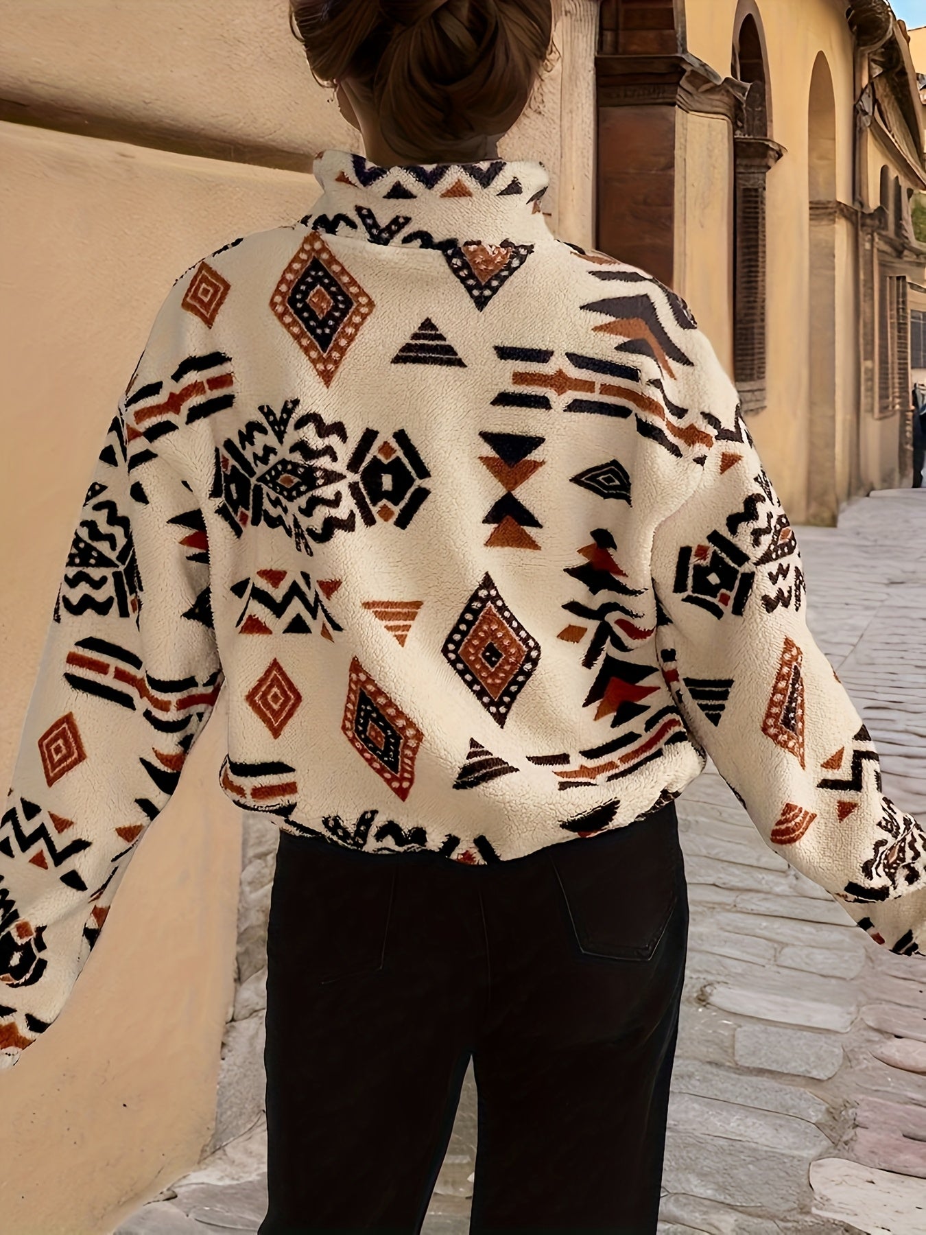 Design: Zip-up with tribal print, stand collar, front pocket
