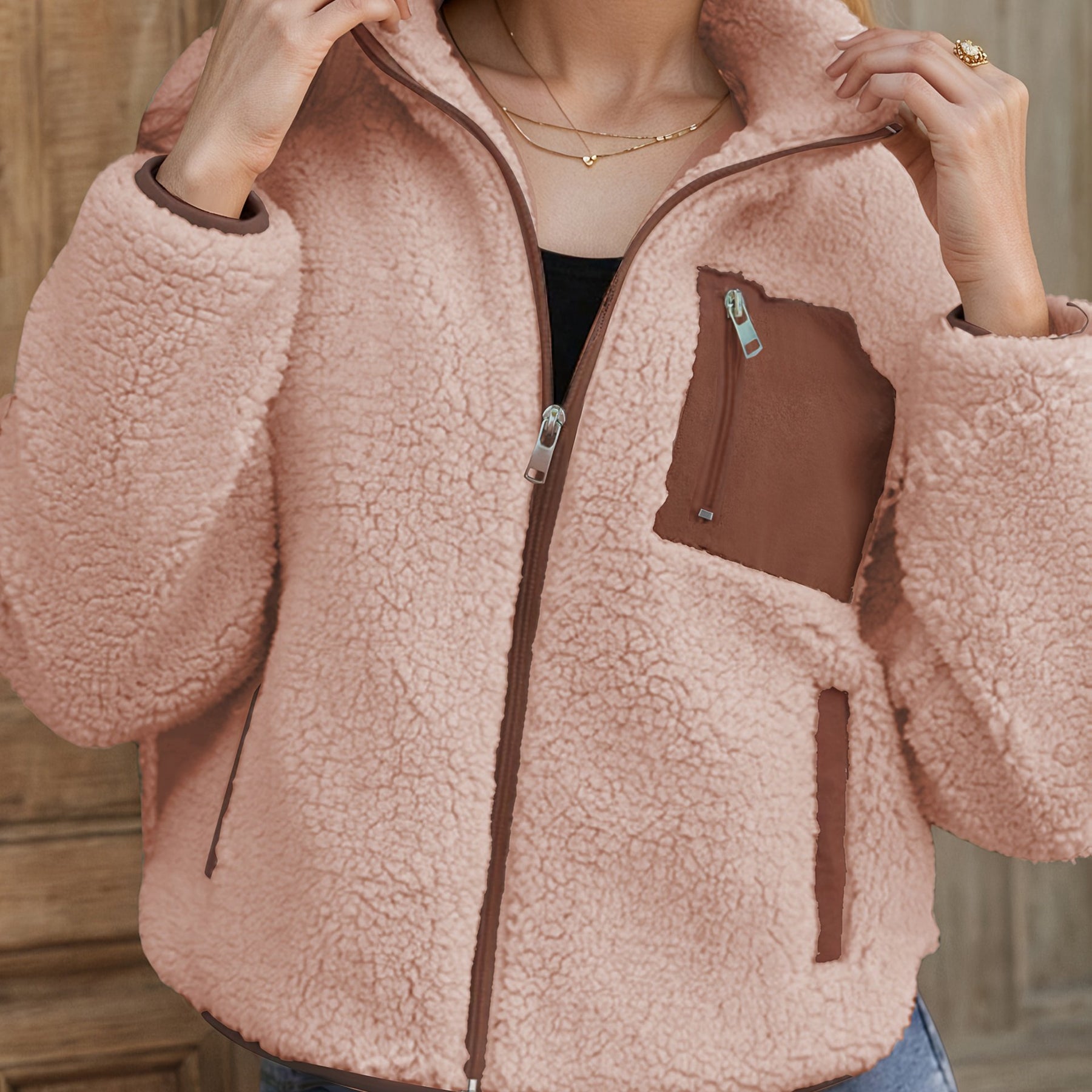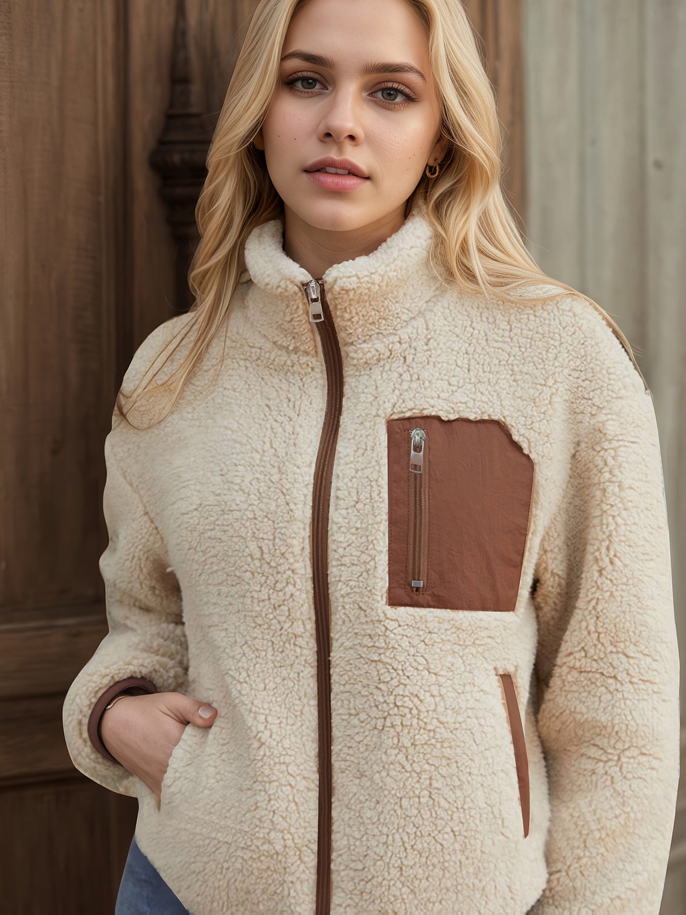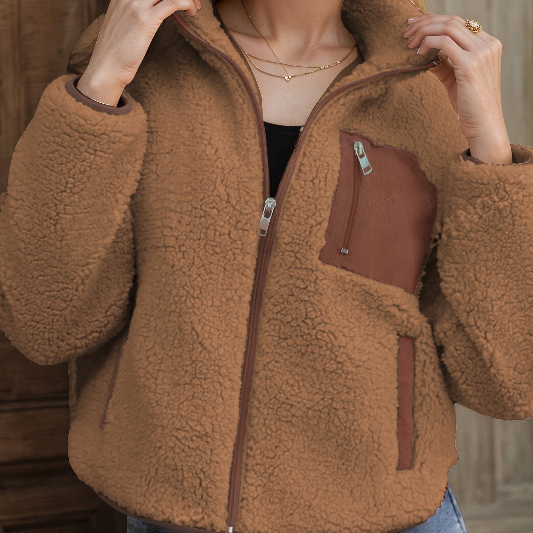 Designed with a contrast patchwork look and lapel-style collar, Raisa™ adds a stylish twist to your everyday outerwear. The soft plush fleece keeps you warm and comfortable, while the zip-up front and button detailing offer both function and flair. It’s perfect for layering through chilly fall mornings or crisp winter evenings.